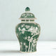 Decorated with a pretty pale green and white floral design this elegant Jar would be at home in any decorating aesthetic. Useful for small items in a kitchen, bath, bedroom, or living room this lovely jar has an easy-to-remove lid. Place it grouped with similar pieces or let this lovely jar shine on its own.